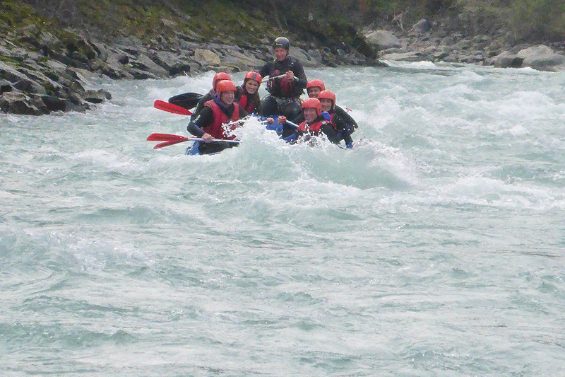 Wir starten am ersten Tag gegen Mittag mit einer Rafting-Tour auf der Imster Schlucht advanced, der sportlichen Schwester unserer klassischen Rafting - Einsteigertour. Sicher geführt von einem staatl. geprüften Raftguide und ausgerüstet mit Neoprenanzug, Helm, und Schwimmweste lassen wir das wuchtige Raft fast zwei Stunden lang gemeinsam durch gischtende Brecher und Walzen tanzen.